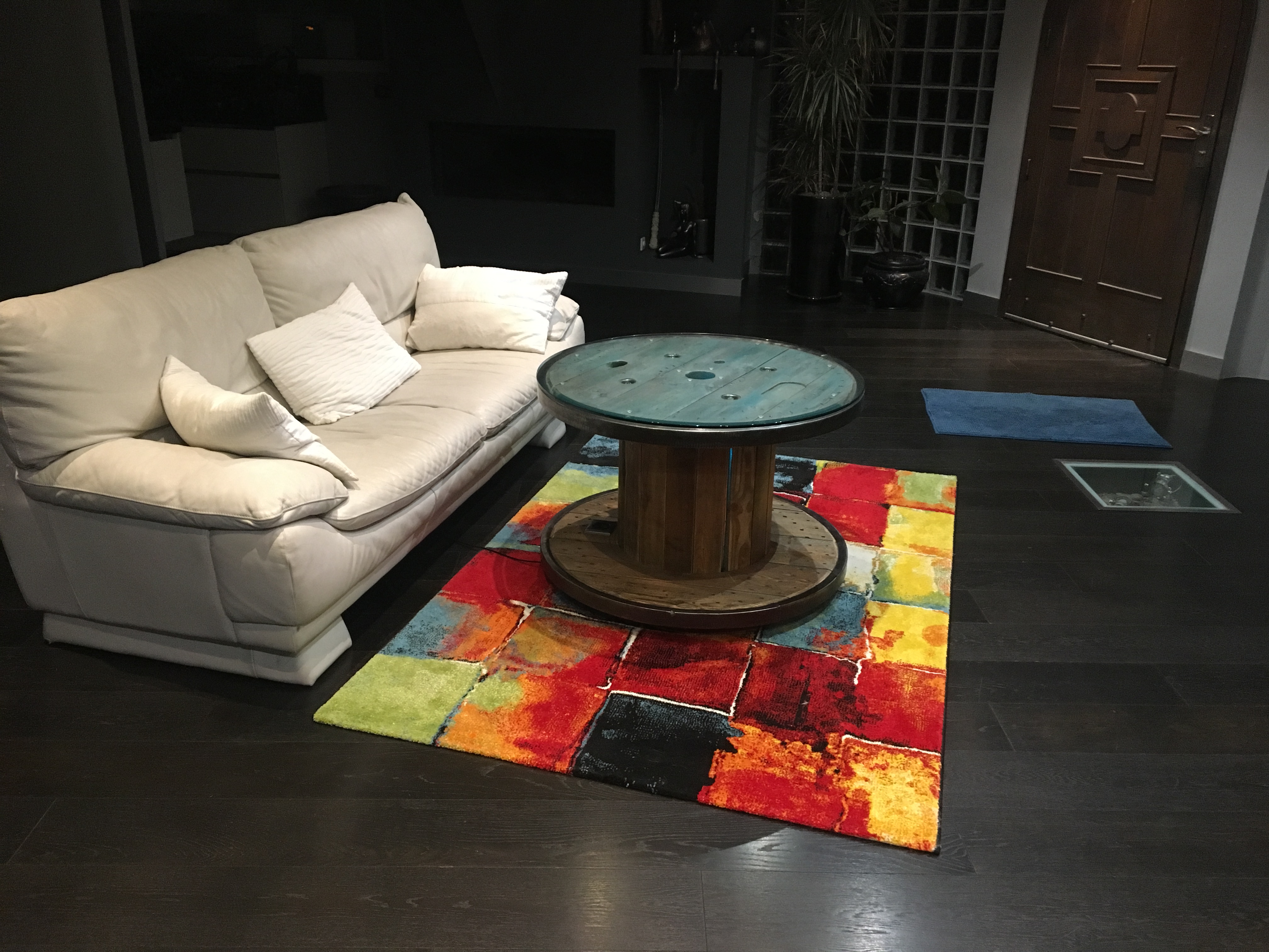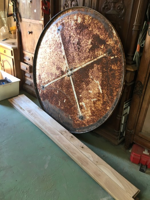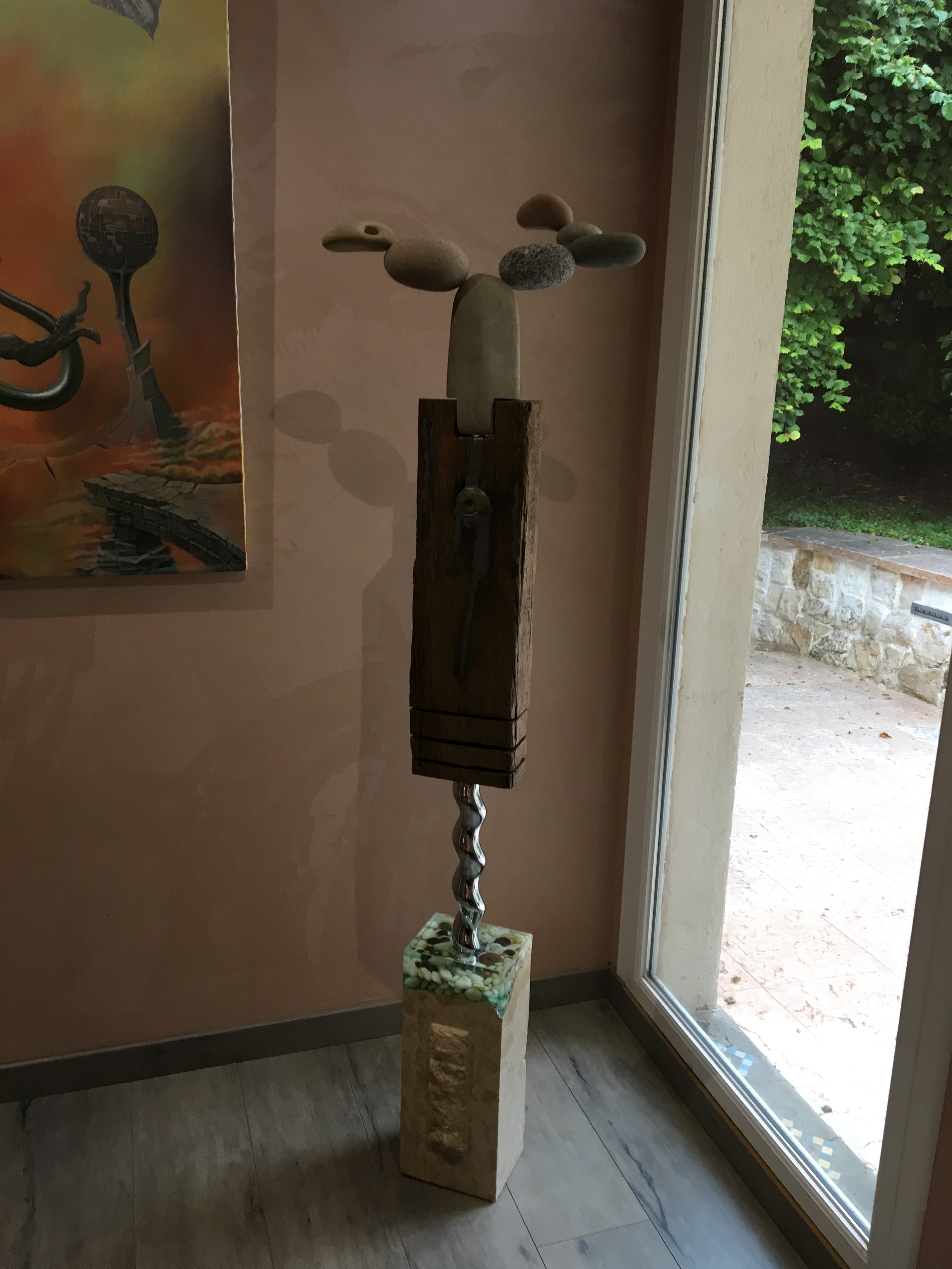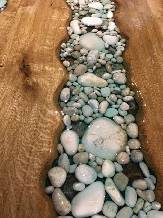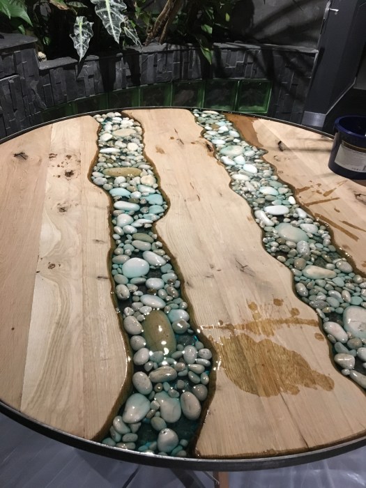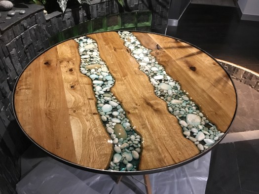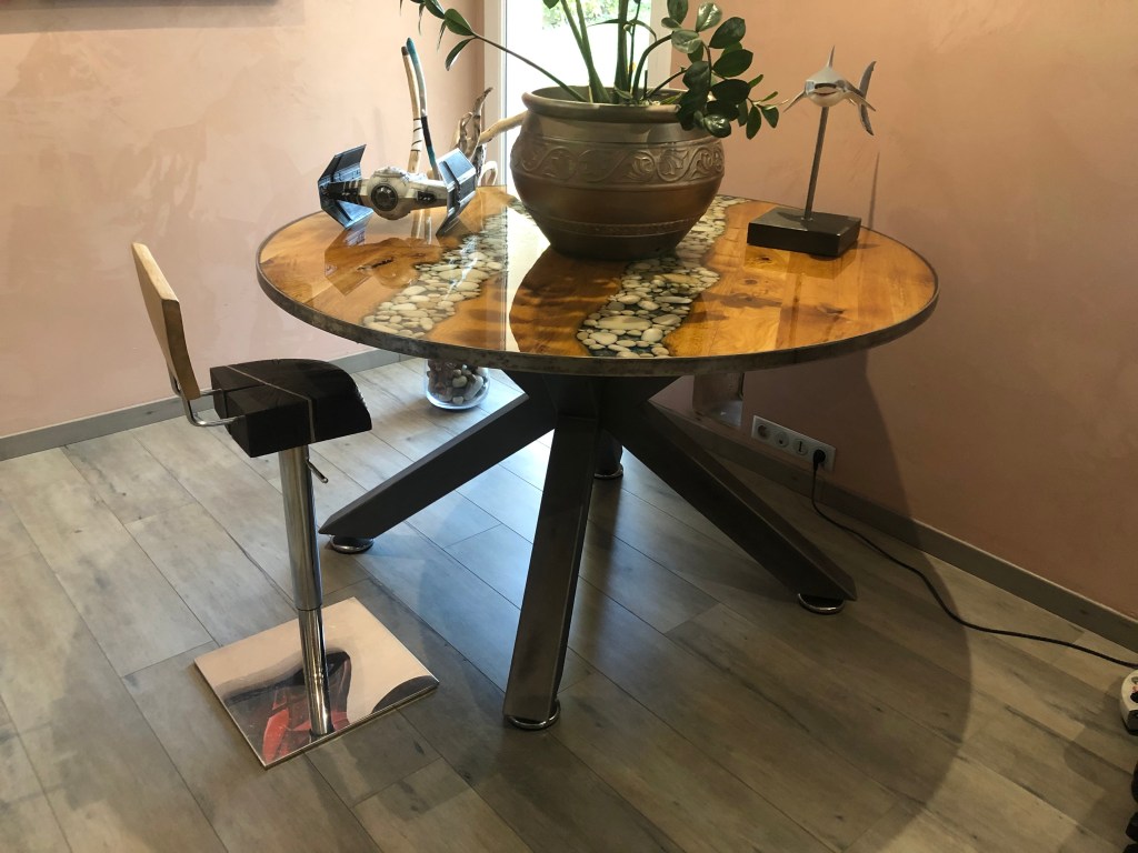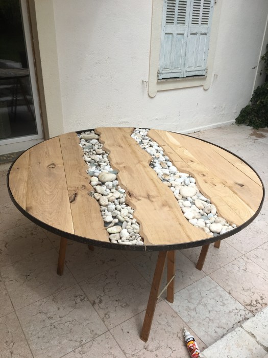 Table ronde métal-bois-galets-résine